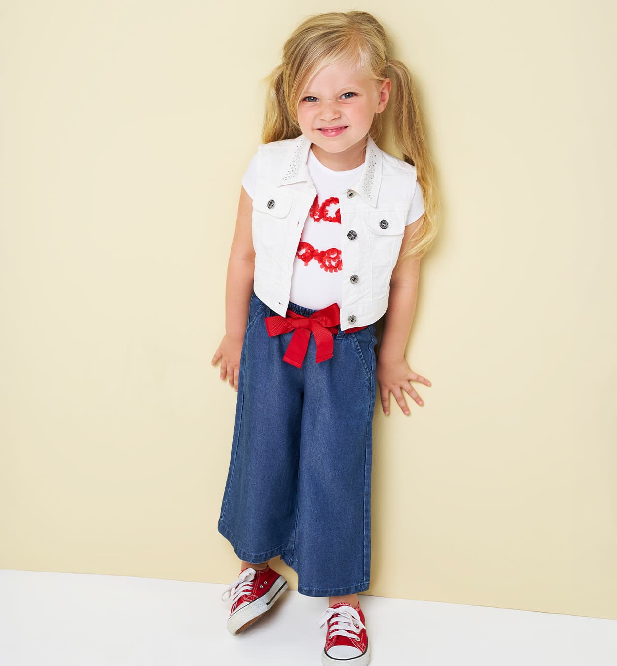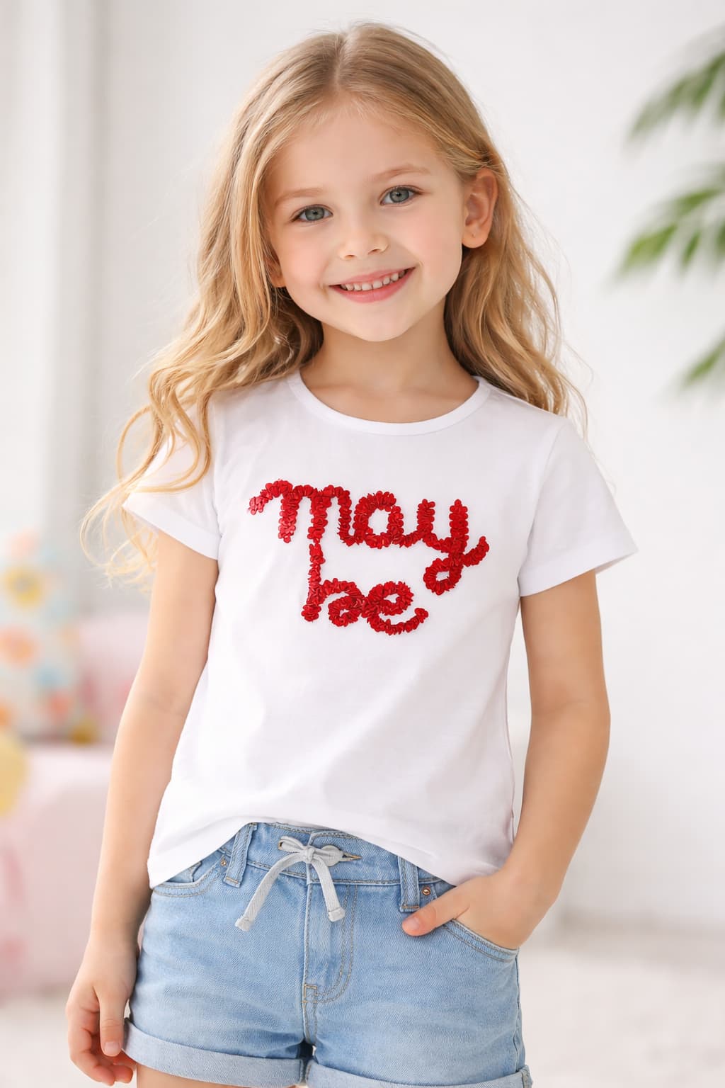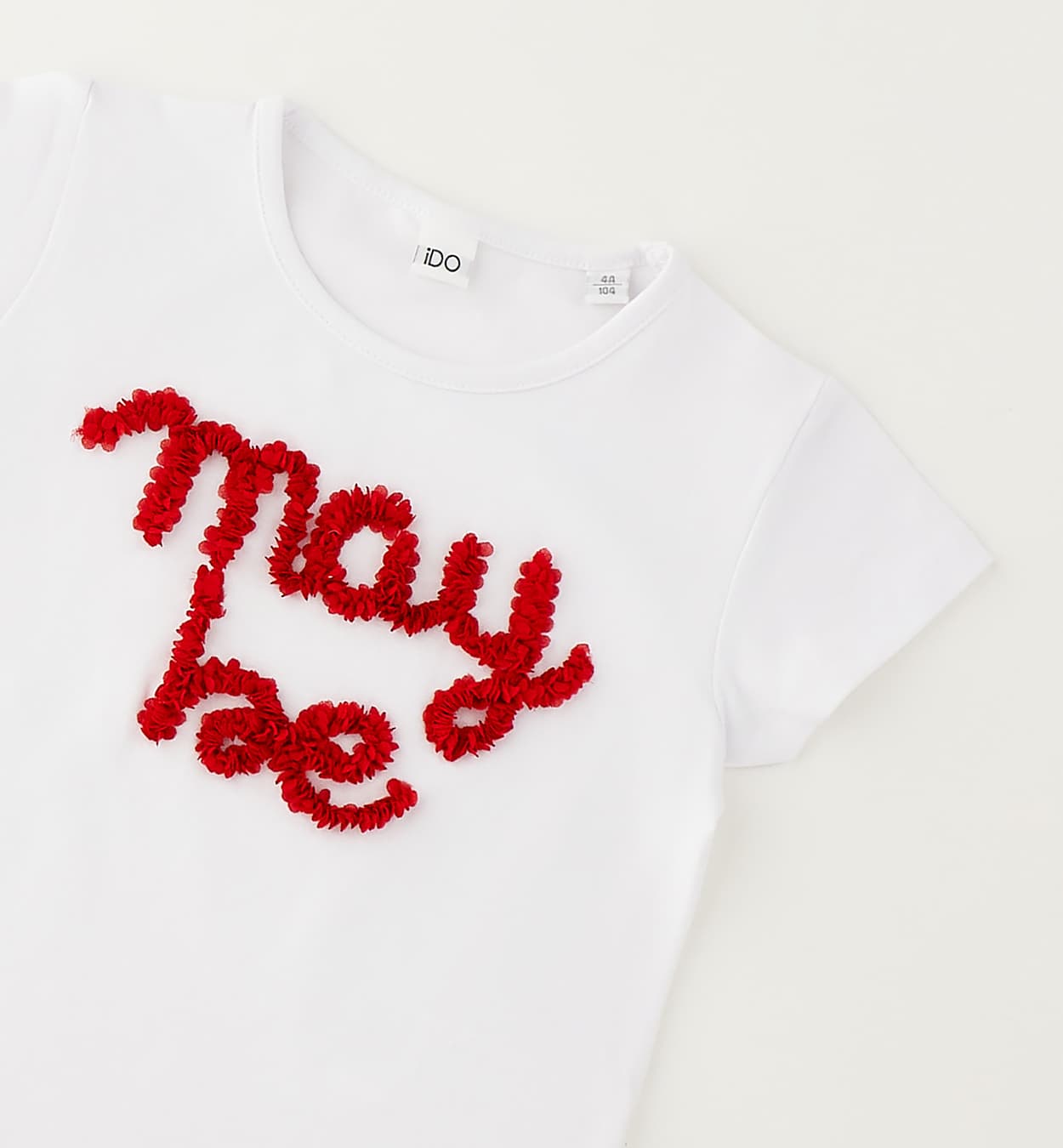 Klasyczny t-shirt dziewczęcy z krótkim rękawem z włoskiej linii iDO, w kolorze optycznej bieli. Wykonany z miękkiej dzianiny bawełnianej z dodatkiem elastanu (95% bawełna, 5% elastan), co zapewnia wygodę i trwałość. Centralną część koszulki zdobi dwurzędowy, czerwony napis „MAY BE” wykonany techniką wypukłego haftu o puszystej strukturze (efekt frotte/bouclé). To uniwersalna baza do wielu letnich stylizacji, łącząca włoski styl z wysoką jakością wykonania